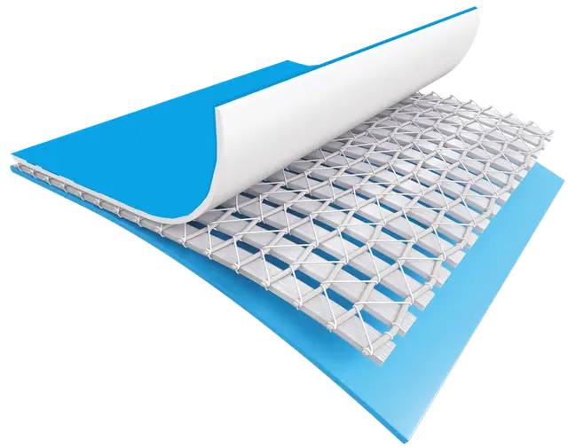 Міцний 3-х шаровий ПВХ із посиленою сіткою. Термічно зварені два зовнішні шари ПВХ оброблені під високим тиском, а всередині між ними – армована сітка з поліестеру (лавсанової нитки).