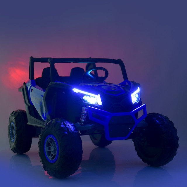 Дитячий баггі обладнаний планшетом, на ньому дитина зможе слухати музику і дивитися мультики, також у авто світяться фари, що робить їзду максимально цікавою.